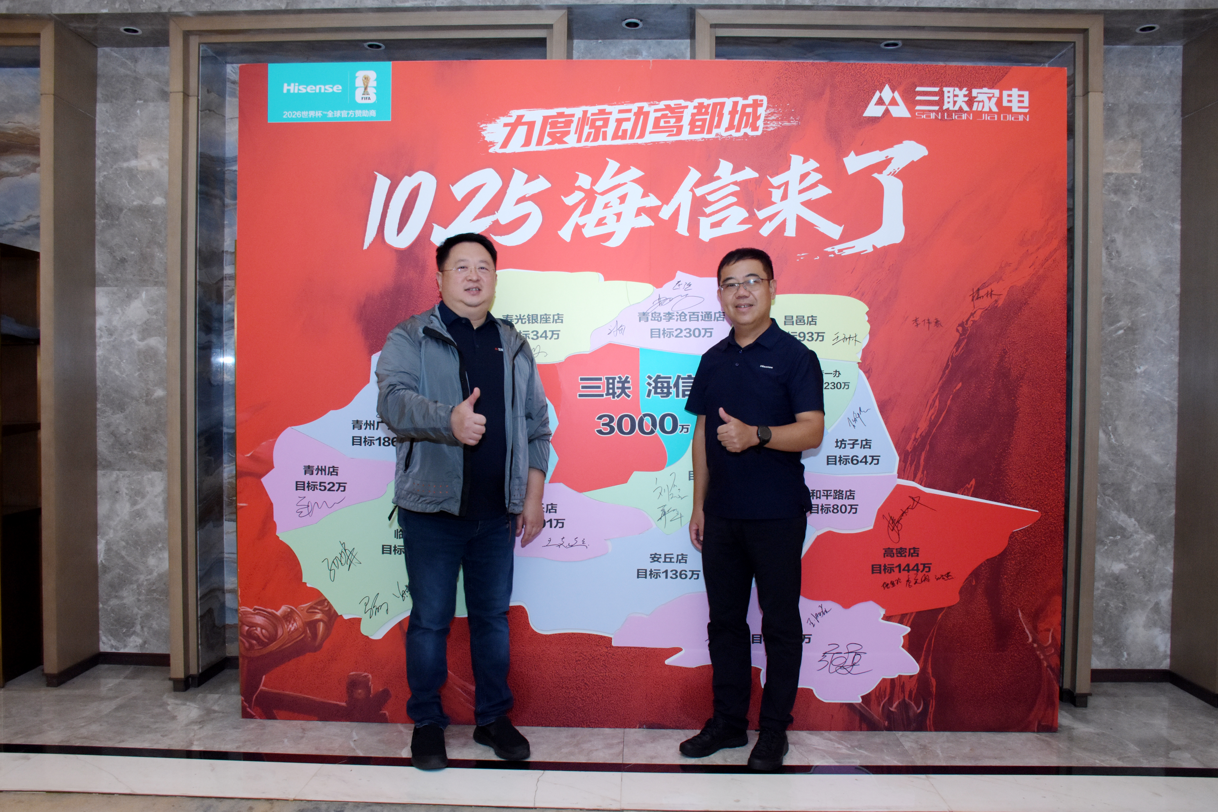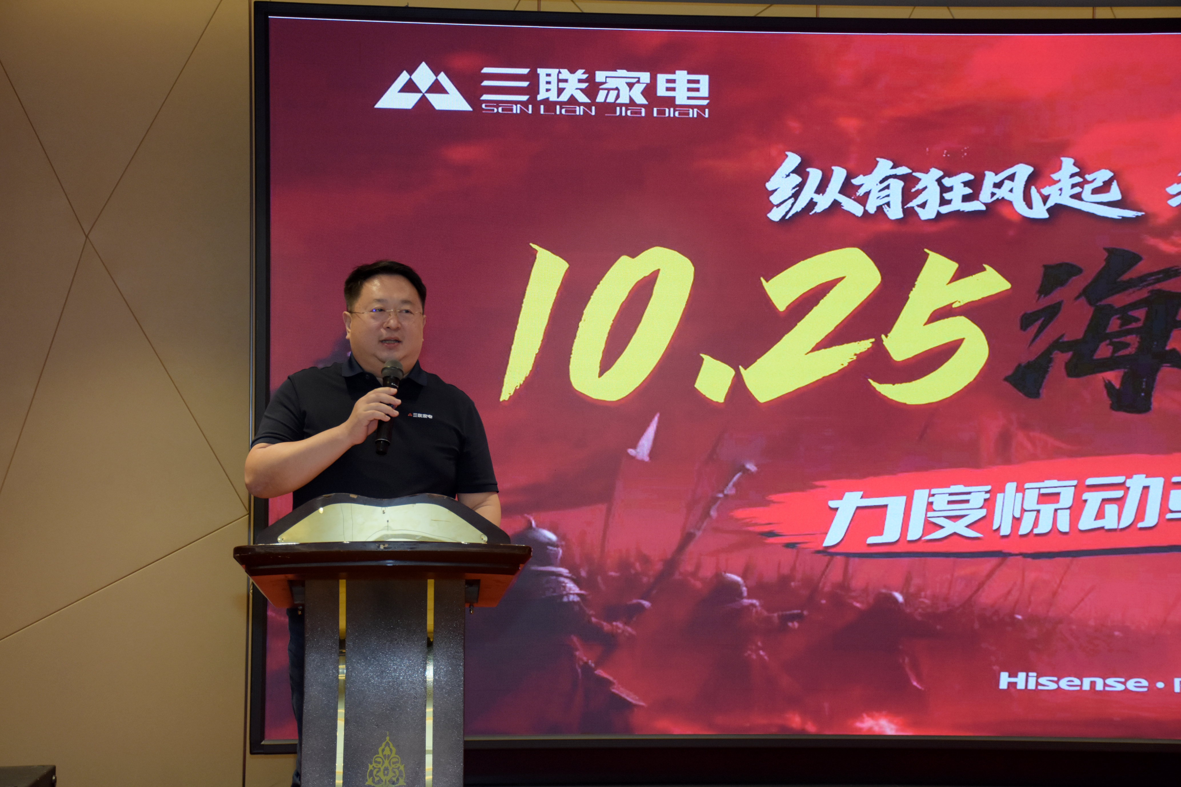 为抢占四季度消费市场高地,深化品牌战略合作布局,10月11日,山东三联家用电器有限公司与海信集团联合召开“三联家电10.25海信来了”动员大会。海信集团副总裁、空气事业部总裁殷必彤,山东三联家用电器董事长车向前携双方核心团队齐聚一堂,以“全员冲锋、全情投入”之势吹响战役号角,正式拉开10月24日至26日大型惠民活动的序幕。此次合作不仅是双方的资源共振,更是对品质消费市场的一次深度开拓,将为消费者带来前所未有的购物体验与超值福利。