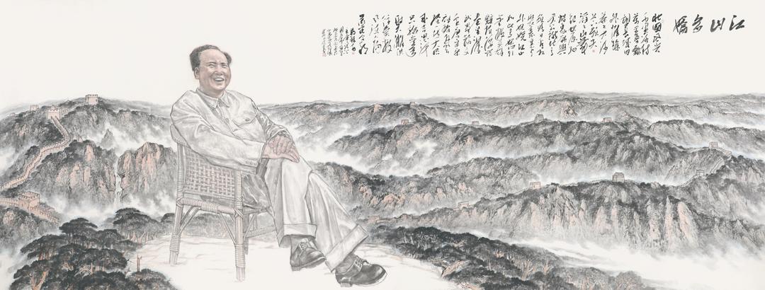 《江山多娇》巨幅国画,画家再现了深秋的香山,层林尽染。一树树枫叶红得如燎原的星火,在苍翠松柏间灼灼燃烧。毛泽东斜倚在旧藤椅里,那藤椅随着他身躯微倾,发出细碎绵长的吱呀声,像是承托着整个民族的重量。
