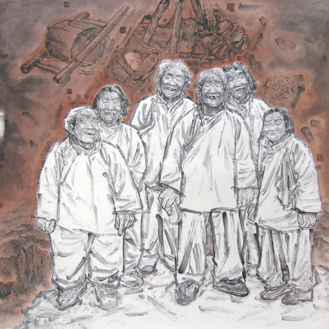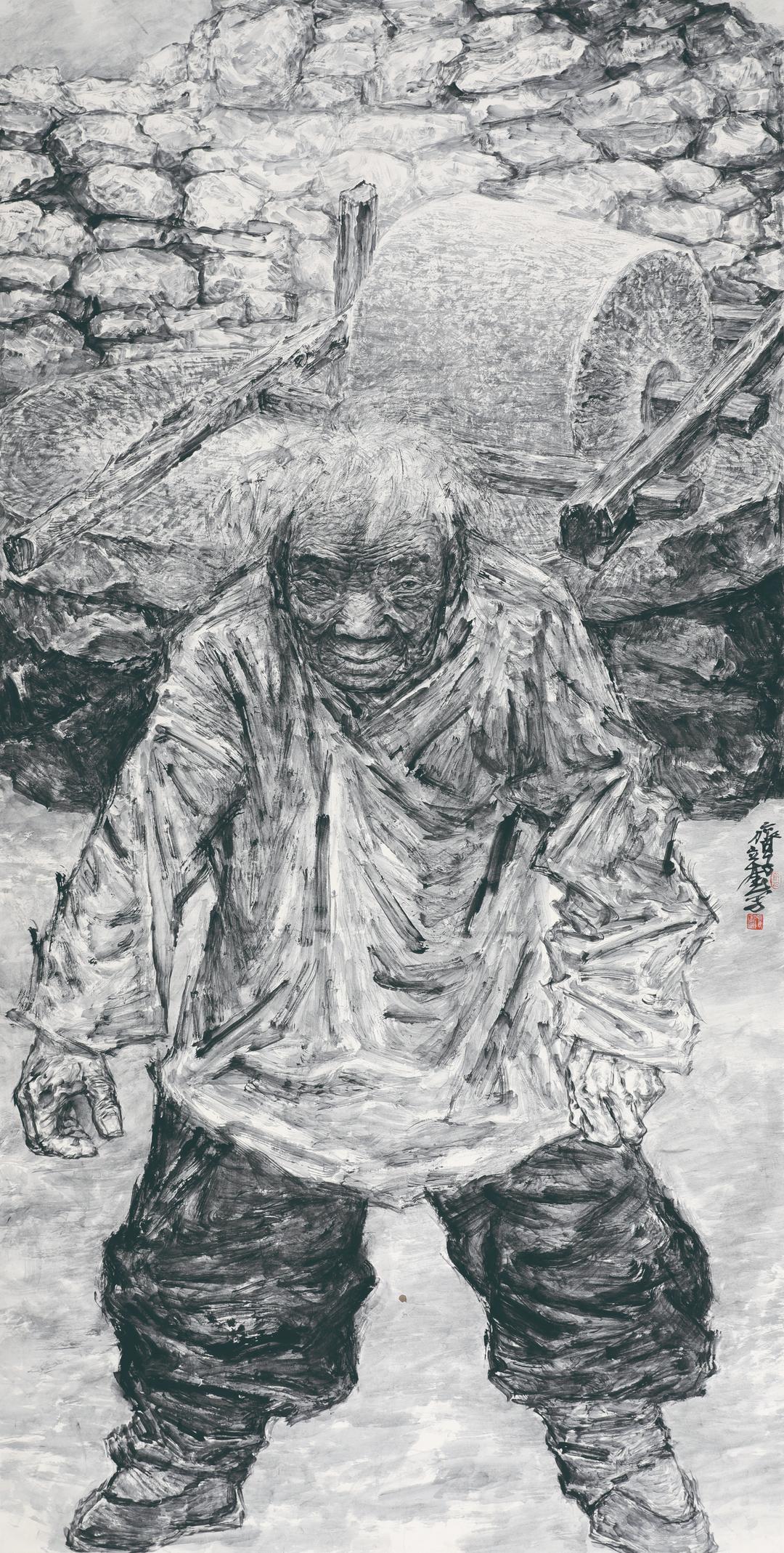 画家在此将母亲的形象与山、与磨盘融为一体。母亲便是行走的山,是有了体温的磨盘。她的沧桑,是山的褶皱;她的坚韧,是岩石的品格;她的奉献,是磨盘无声的旋转。这幅画的深层内涵,正是要向我们揭示:历史的宏大叙事,从来都是由无数这样无名的、个体的牺牲与坚守所书写。所谓的人民,正是这无数个具体而微、饱经风霜却巍然屹立的母亲。