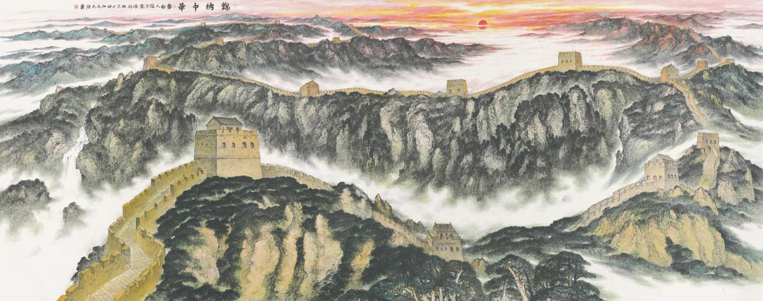巨幅国画《锦绣中华》作者历时半年完成,在我们眼前铺展成一个沉默而磅礴的世界。没有过多绚烂的色彩,只有墨色的变化和冷暖的对比在宣纸上晕染、交融、生发,仿佛天地初开时的那股元气,凝固成了这蜿蜒万里的脊梁。长城,便是这元气凝聚的魂。它不像砖石砌成的建筑,更像一条从大地骨骼中自然生长出的苍龙。画家以枯笔焦墨,皴擦出山岩的粗砺肌理,那笔触如刀如斧,带着千年的风霜。而长城,就以这焦墨勾勒的硬朗线条,沿着山脊的走势,跌宕起伏,时而在云雾中隐没如游龙潜渊,时而攀上巅峰,显露出雄浑的敌楼,如同龙首昂然问天。它不是被安置在山水之间,它就是从山水中生长出来的,是这大好河山自己挺起的、不屈的铮铮傲骨。在这片苍莽的玄色世界里,画的右上角,是一天之中唯一的光源,也是整个画面的精神源点——东方日出。