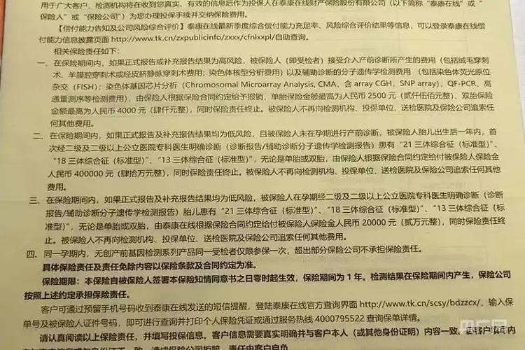 记者在杜先生提供的《保险知情同意书》中看到,对于理赔要求的约定为:在保险期间内,如果正式报告及补充报告结果均为低风险,且被保险人未在孕期进行产前诊断,被保险人胎儿出生后一年内,首次经二级及二级以上公立医院专科医生明确诊断(诊断报告/辅助诊断分子遗传学检测报告)患有“21-三体综合征(标准型)”“18-三体综合征(标准型)”“13-三体综合征(标准型)”,无论是单胎或双胎,由保险人根据保险合同约定给付被保险人保险金人民币40万元,同时保险责任终止。