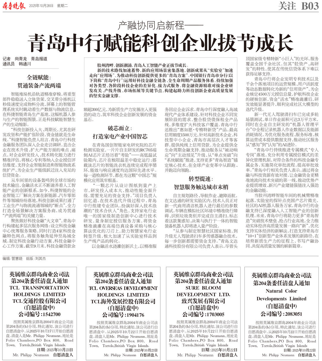 当胶州湾畔智能车间的机械臂精准起落,实验室的探针点亮国产芯片微光,社区的AI机器人服务万家,青岛中行的金融支持已深度融入人工智能产业的创新肌理。未来,青岛中行将助力更多“青岛智造”突破技术壁垒、抢占行业高地,全力推动实体经济高质量发展一路向“新”,优化支持实体经济的新解法,打造支持青岛市“10+1”创新型产业体系发展的新路径,在培育新质生产力的征程上,书写产融协同、共促高质量发展的崭新篇章。