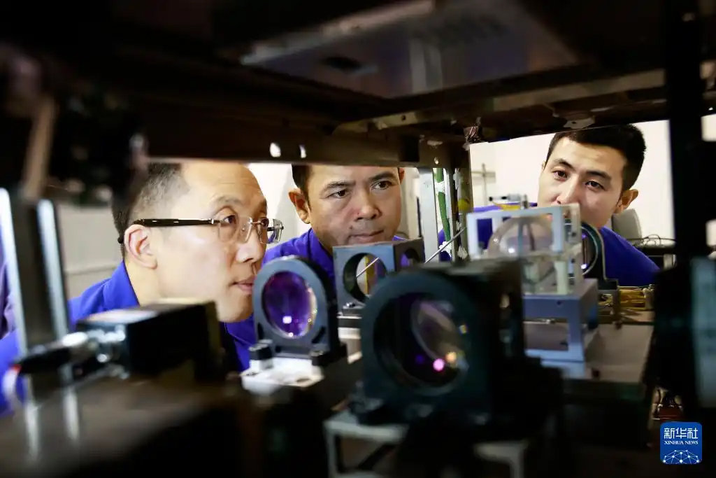 张洪章(左)、张陆(中)、武飞在检修设备(2025年8月21日摄)。新华社发