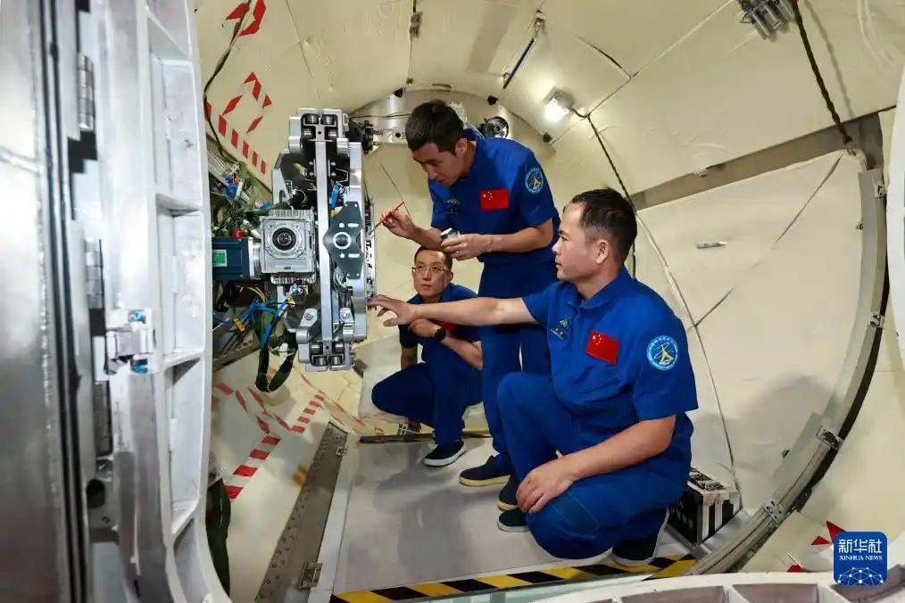 武飞(左)、张陆(中)、张洪章进行植物培养训练(2025年8月28日摄)。新华社发